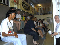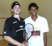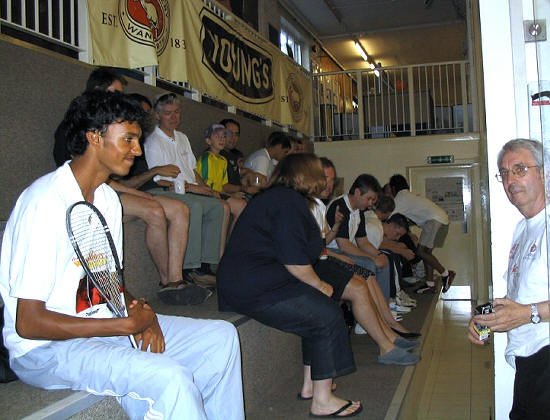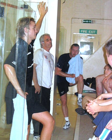 2004: The Willstrops at Wimbledon As a general rule, I don’t like exhibition matches. But I must say, the Willstrops know how to entertain. On a very warm Saturday evening, Mr Willstrop Senior, Mr Willstrop Junior, and Nick Taylor (who Malcolm introduced as “from Lancashire”, stressing the huge gap between Yorkshire and the rest of the world…) came to Wimbledon Racquets and Fitness Club to entertain a select crowd who had the good taste to prefer the hot atmosphere of a squash club to the delights of a warm summer evening outside a café in Wimbledon Village. Let me tell you, we were in for a treat! Willstrop Senior started by explaining to us the programme of the evening, then introduced the players (“Nick Taylor, now the advancing years are catching up with him”…, and “James Willstrop, an extraordinarily well-bred young man…”). James and Nick started with a quick warm up, commented by Malcolm. Then