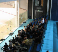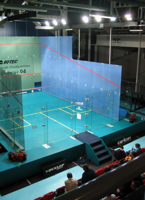 officials, “which scoring are we playing tonight?”.Sorry, but it still makes me smile… It was a bit of a shock, I must say. I’m used to our Surrey League, where we have a very relaxed, informal atmosphere, a few spectators, simple, looking more like an evening between mates (off court of course, as the matches are always extremely disputed). And here I was in Manchester, at Sportcity. Big place. Glass court. I would say 200 people. Lovely program handed out, full of useful and up to date information. And a compere! Yes,