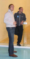 GOOD BATTLE It was a short match (33 minutes), but very entertaining. After James took the first two, we thought the match could be over. But David Evans has got a lot left, and he shut us up by taking a beautiful 3rd, in which he led 6/1 and 7/2 before winning it 9/5. But James recovered quickly, and took the 4th in 6 minutes, 9/5. |