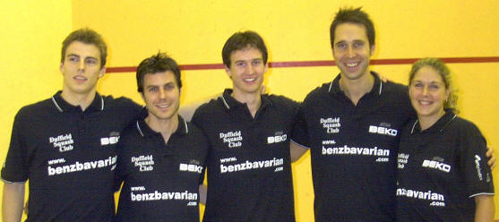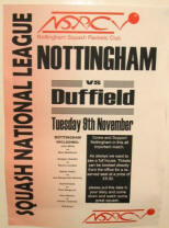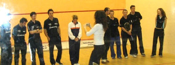 normally wins in three. And today was going to be no different…I didn’t give much chances to Nottingham to start with, as I knew that Greg had injured his back on Sunday morning. But if he started the match looking a bit like a tray with legs, his back, his muscles started to warm up, and he got better as the match went along… Quite logically, Renan takes the lead in the first game, 4/1, to be caught up by the precision of the shots of his compatriot. 4/4. From then on, Greg takes the control of the T, forces Renan to make mistakes, and takes the first game in 12 minutes, 9/4. The second one is SOOO close. 4/4. 5/5. 8/8. A few lets at game ball for Grégory (I counted three given, one refused), and he gets the second in 16 minutes. As Renan throws his racquet in disgust, he is given a conduct warning by the ref. “Everybody does it here, Parke did it… It’s a Nottingham Specialty”, says the French while leaving the court… Once again, the third will be close, Greg making too many mistakes, put under pressure by a more attacking Renan. 8/8. The pace is once again extremely high, with period of slowing down, well varied. It’s a beautiful match indeed, very disputed, both boys refusing to let their team down. But Greg is just slightly more precise, and gives Nottingham the ultimate point they needed. Nottingham 3, Duffield 2. |