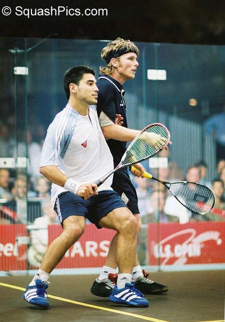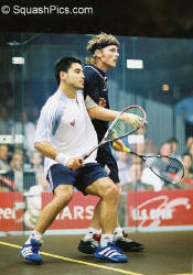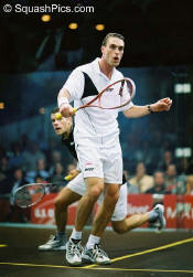 [5] Thierry Lincou (FRA) Nicol & Palmer move In games one and two, Theirry Lincou played with incredible intensity and accuracy. But Nicol matched each point, even though Lincou worked him hard standing virtually still on the T while Nicol chased balls short, long and deep into the corners. After an incredible volley for the 12th and go ahead point in game one, Nicol picked up the final three to take the game in just 17 minutes. With his backhand bringing him nothing but tin in game two, Lincou lost focus as Nicol worked the right corner with no mercy. But until the end, Lincou put forth a great game and by no mean handed the match to Nicol. Post-game Lincou said, "After game one, Peter took control