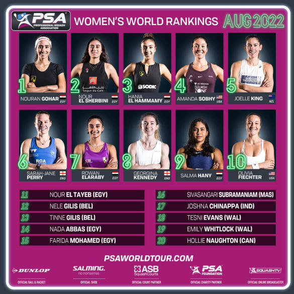 PSA Women’s World Rankings Top 20 – August 2022
