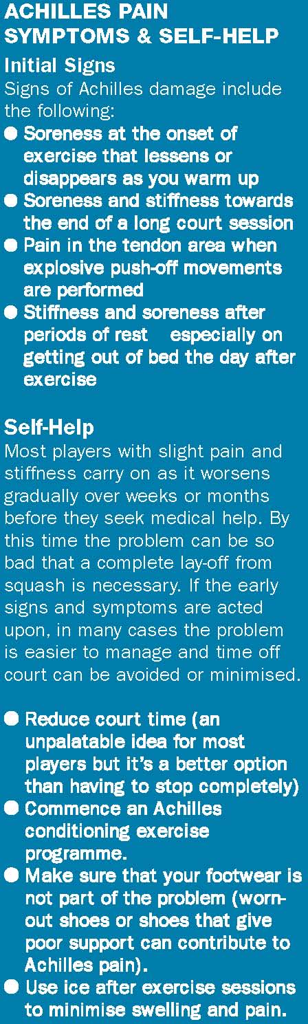 explains why the Achilles can be a pain and why, surprisingly, the best method of treatment can be exercise. “I thought my opponent had hit me with the ball or with his racket.” This is the classic description that squash players who have snapped their Achilles tendon give when recounting the moment of injury. Snapping or rupturing the Achilles, which is the largest tendon in the body, is a serious injury. Happily it is a rarely encountered problem for squash players. However, the Achilles is a common cause of pain. Achilles pain ranges from mild discomfort that doesn't interfere with your game to agony that prevents even a modicum of exercise. Let's start with a look at the thankfully rare but dramatic injury of Achilles tendon rupture and then consider the much commoner Achilles conditions, which afflict many squash players.
