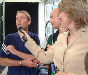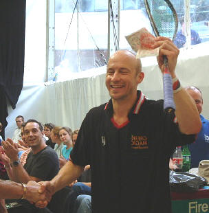| Walker collects the Cash from Norms It's not often you'll see a 35-year-old ranked in the world's top ten in a physically demanding sport like squash. Ross Norman, the man who ended Jahangir Khan's five year unbeaten run to become World Champion was one of them, and 'Norms' was confident that no-one else would make it. So confident, in fact, that when Chris 'Willy' Walker expressed his own confidence at being able to achieve the feat Norms laid a cool £100 on the line. That was five years ago, but it looked bad for Chris coming into 2001, as the then 33-year-old had slumped to 40 in the PSA rankings. But a fantastic recovery, reaching the final of the British Open as a qualifier on the the day before his 34th birthday relaunched the Essex marvel's career. He soon started to reach the later stages of tournaments again, and rocketed back up the rankings. Last week saw Chris reach the 35 milestone, and he was definitely within that elite top ten, so this week at Broadgate it was payup time for Norms. A gentle warm-up first, with Norms and Willy taking on Tim Garner and Stewart Boswell in a doubles exhibition before the final, then it was time to pass the cash, with Sue Wright mistress of ceremonies. "It's a fantastic achievement," Ross told the packed house at the finals. "I never thought anyone else could do it, but Chris has proved me wrong, well done Willy!" Norms let his true feelings slip though, when Sue planted the inevitable "how do you feel?" question. "Well, I'm gutted about the money, actually," admitted Ross. Happy birthday, Chris! |