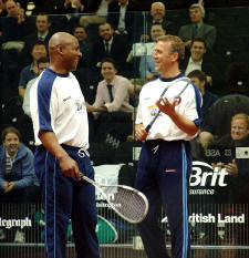 After a brief coaching session with John White,   former Wigan and Great Britain rugby league star, Ellery Hanley, and former England and Surrey CCC cricket captain Alec Stewart played each other in front of an enthusiastic crowd on the tournament court.