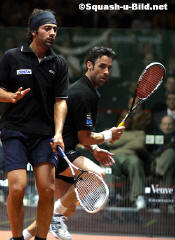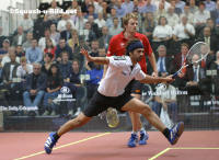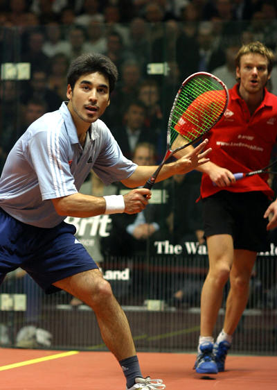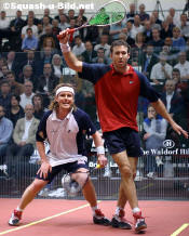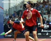 | 10-May-04: NICOL SLUMPS TO SHOCK DEFEAT ... Tom Maidment reports from Broadgate England's world no.9 Nick Matthew caused a major upset at day one of the Brit Insurance Super Series Finals in London tonight, thrashing compatriot and world no.1 Peter Nicol by 3-0. Matthew, England's fastest rising squash star, produced a stunning performance at The Broadgate Arena to confirm his growing stature in the game. The 23-year-old, making his debut appearance at the Finals, demolished Nicol in just over half an hour as he raced to a 11-5, 11-7, 11-4 win. "I'm amazed, almost speechless. I knew Peter was looking a bit tired but I never expected that," said Matthew. "I was joking before the match that I would do well to take a game off Peter so to win like that was unbelievable. I rate Peter as one of the top five players of all time and it was my ambition to beat him before he retired." Tomorrow Matthew will face defending champion Jonathon Power of Canada who crashed to a 3-0 defeat against Scotland's world no.2, John White in the opening Harrow group match of the evening. Power, a late call-up for the injured Anthony Ricketts, was brushed aside in just 27-minutes as White, the Nottingham-based no.2 Seed, opened his title bid with an impressive 11-4, 11-6, 11-4 victory. Earlier in the evening England's Lee Beachill defeated Egyptian world champion Amr Shabana 3-1 to get off to a winning start in the Fleet Group. Beachill, the world no.4 from Yorkshire, looked in superb form as he withstood a ferocious onslaught of attacking shots from the left-handed Shabana who was making his first appearance at the Finals. The match was the first in history to be played under the PSA's new scoring system of point a rally to 11 instead of 15. "The scoring system is interesting and players will take a while to adjust to it," said Beachill. "The good thing is that the finishing line comes in sight a bit earlier so you are encouraged to attack." Top Seed Thierry Lincou, the French world no.3, defeated Australia's Super Series Finals debutant Joe Kneipp by 3-1 in the evening's other Fleet Group match. Lincou, who finished third in the event last year and runner-up in 2002, played some stunning squash in a high quality match to claim victory in 70 minutes by 11-9, 11-8, 10-11, 11-4. Results: Harrow Group John White (Sco) bt Jonathon Power (Can) 11-4, 11-6, 11-4 Nick Matthew (Eng) be Peter Nicol (Eng) 11-5, 11-7, 11-4 Fleet Group Lee Beachill (Eng) bt Amr Shabana (Egy) 11-9, 4-11, 11-10 (3-1), 11-8 Thierry Lincou (Fra) bt Joe Kneipp (Aus) 11-9, 11-8, 10-11 (0-2), 11-4 |
