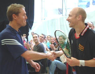 | Walker collects the Cash from Norms It's not often you'll see a 35-year-old ranked in the world's top ten in a physically demanding sport like squash. Ross Norman, the man who ended Jahangir Khan's five year unbeaten run to become World Champion was one of them, and 'Norms' was confident that no-one else would make it. So confident, in fact, that when Chris 'Willy' Walker expressed his own confidence at being able to achieve the feat Norms laid a cool £100 on the line. That was five years ago, but it looked bad for Chris coming into 2001, as the then 33-year-old had slumped to 40 in the PSA rankings. But a fantastic recovery, reaching the final of the British Open as a qualifier on the the day before his 34th birthday relaunched the Essex marvel's career. He soon started to reach the later stages of tournaments again, and rocketed back up the rankings. Last week saw Chris reach the 35 milestone, and he was definitely within that elite top ten, so this week at Broadgate it was payup time for Norms. A gentle warm-up first, with Norms and Willy taking on Tim Garner and Stewart Boswell in a doubles exhibition before the final, then it was time to pass the cash, with Sue Wright mistress of ceremonies. "It's a fantastic achievement," Ross told the packed house at the finals. "I never thought anyone else could do it, but Chris has proved me wrong, well done Willy!" Norms let his true feelings slip though, when Sue planted the inevitable "how do you feel?" question. "Well, I'm gutted about the money, actually," admitted Ross. Happy birthday, Chris! |